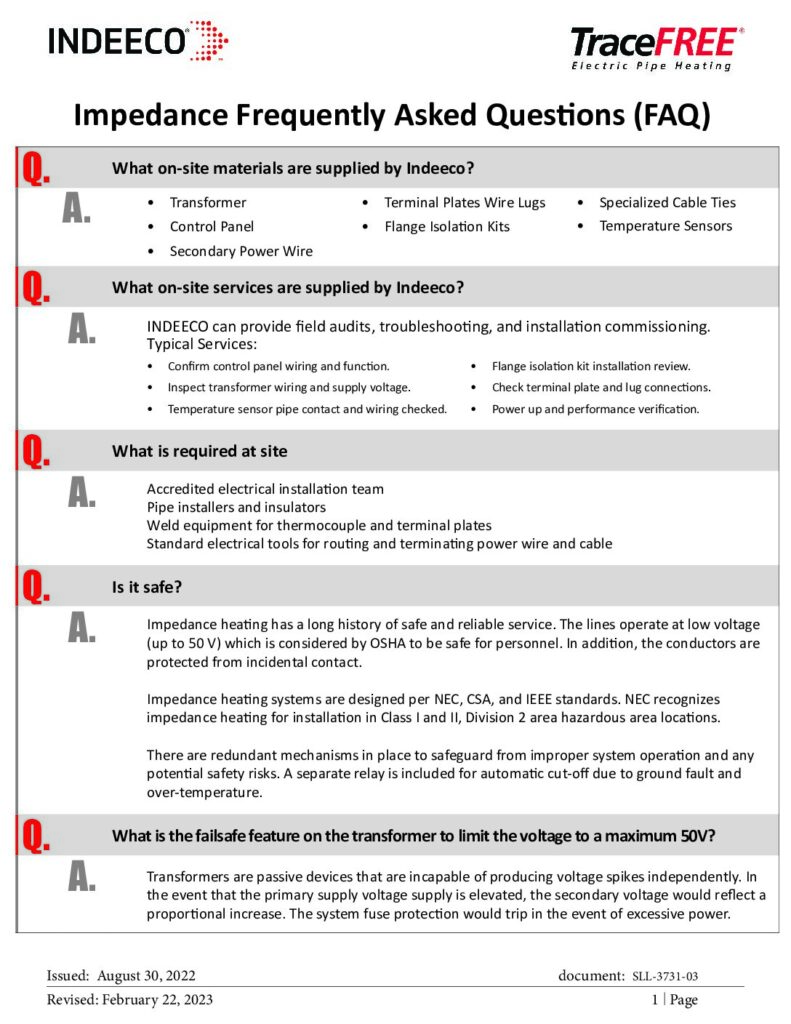 A TraceFREE Impedance Pipe Heating System is a unique, safe, and proven method for electric pipeline tracing and heating. The pipe actually becomes the heating element when low AC voltage is applied to it by a special, custom-designed transformer.